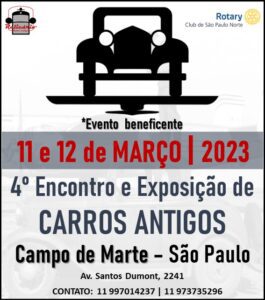O 4º Encontro e Exposição de Carros Antigos Campo de Marte é beneficente, promovido pelo Rotary Club de São Paulo Norte e pela Relicário Autos Antigos, com muita diversão e vedetes da história do automobilismo. Clubes de Automóveis Antigos, comerciantes do setor, restauradores e pessoas que buscam peças para restauração também vão participar da grande festa.