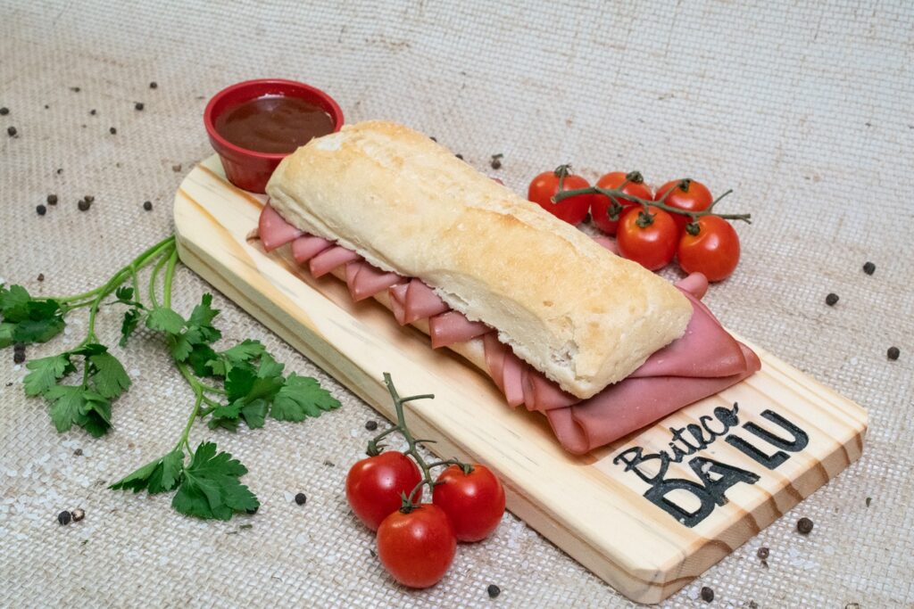 Sanduíche de mortadela italiana ceratti no pão ciabata, blend de queijos, tomate cereja confitado, mostarda dijon e pesto de rúcula, servido em fatias. Acompanhado de molho de barbecue de goiabada.