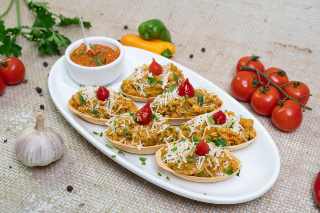 Cestinha com pernil no barbecue, acompanhado de molho pesto.