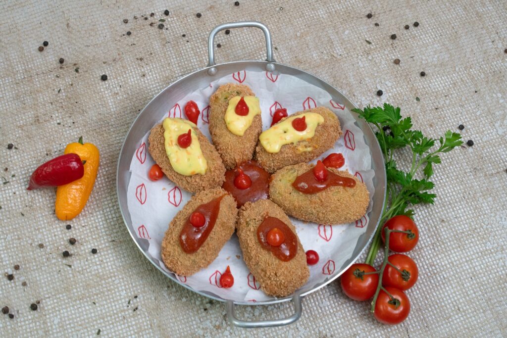 Croquete de frango com um toque de gengibre. Acompanha um molho mineiro.