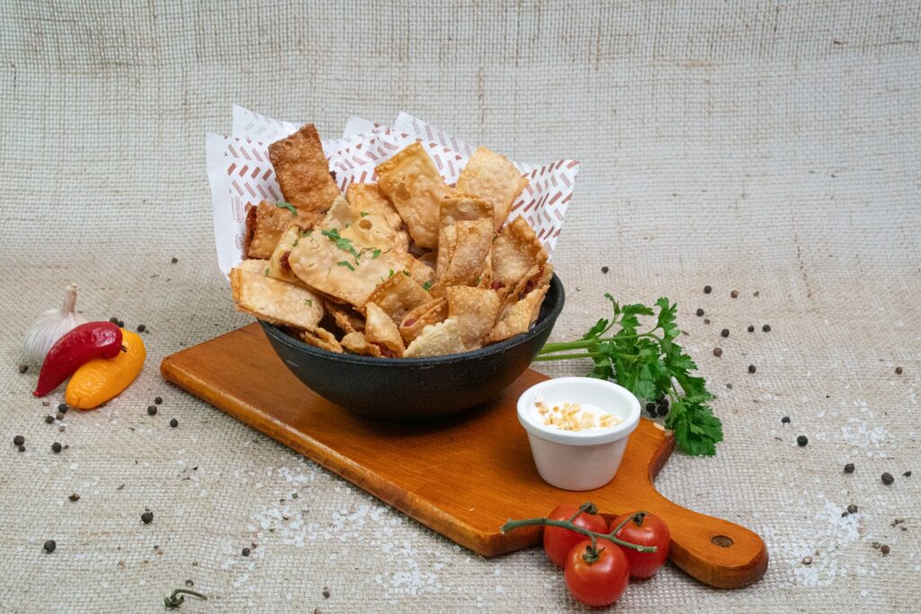 Copa lombo cozido lentamente em baixa temperatura ao molho de ostra, limão, Demi-glacê e óleo de gergelim torrado, finalizado com cebolinha fresca, empanado e frito. Crocante por fora, macio e suculento por dentro.