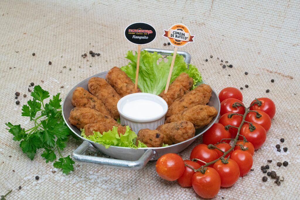 Bolinha de queijo recheado com costela. Acompanha molho de pimenta curtido na cachaça e melado de cana.