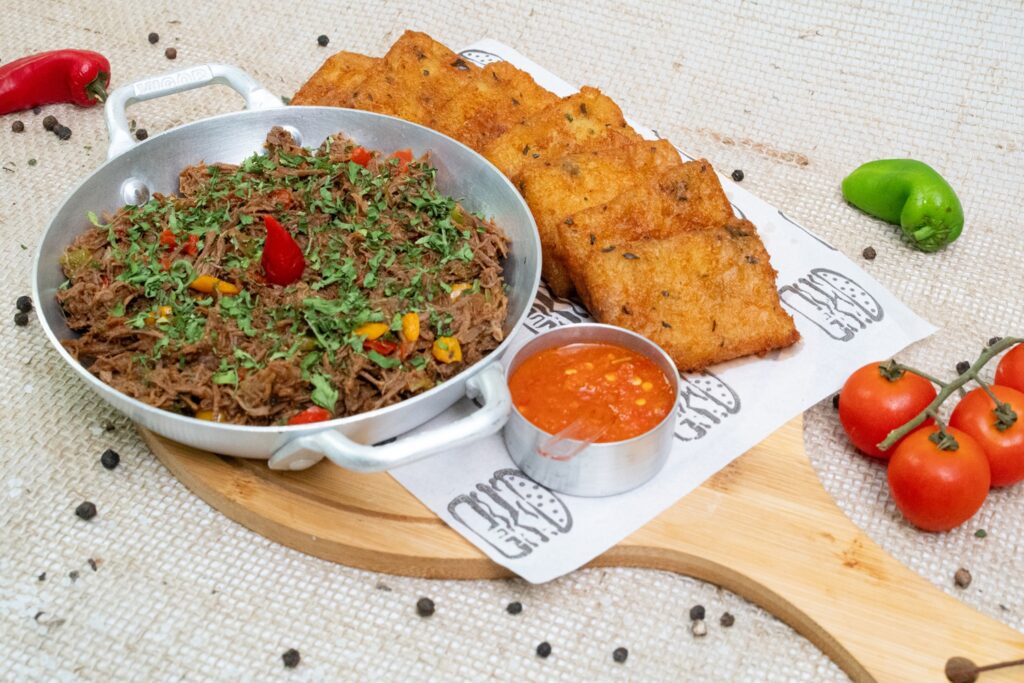 Torresmo servido com geleia de goiaba com pimenta e mandioca com pate de alho especial