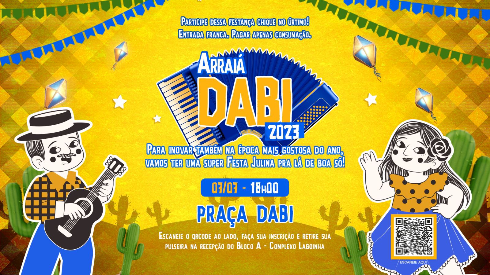 O Dabi Business Park promove no dia 7 de julho, a partir das 18 horas, a primeira edição do Arraiá Dabi na Praça de eventos do centro empresarial. A festa julina é aberta ao público e tem entrada gratuita. Para participar é preciso se inscrever na plataforma Sympla (https://www.sympla.com.br/evento/arraia-dabi-business-park/2020763) e retirar pulseira na recepção do Bloco A – Complexo Lagoinha, de 3 a 7 de julho, para entrada no evento.