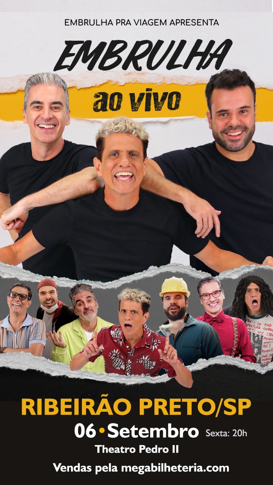 Canal do Youtube com números de visualizações impressionantes e com presença de destaque em todas as redes sociais o EMBRULHA PRA VIAGEM – formado pelo trio de atores Marcelo Laham, Maurício de Barros e Willians Mezzacapa – chega aos teatros do Brasil com um espetáculo que promete capturar a essência do grupo presente no digital e transporta-la para o ao vivo. Suas performances unem que transformam humor e cotidiano em esquetes pra lá de engraçadas. O espetáculo traz para perto do público grande parte da trupe de personagens que são sucesso no Youtube. Fernando Burrão – aquele mesmo que não saiu da quinta série; Eugênio e seus ensinamentos sempre acompanhados do seu peculiar “Oi tuuuurma”; Wesley com seu famoso “Chegou o lanche!” são alguns dos presentes ao espetáculo. Ao todo são mais de 20 personagens que se revezam num projeto de humor leve e sutil. O espetáculo tem cerca de uma hora e meia de duração