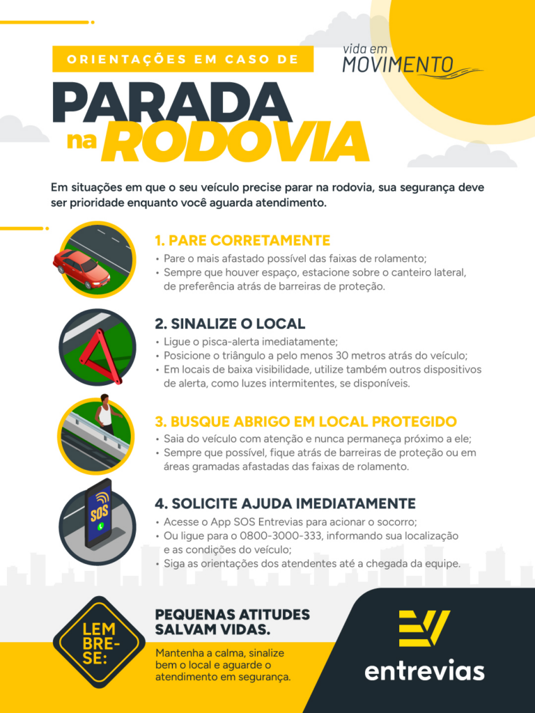 Parar em uma rodovia é sempre uma situação de risco, seja por pane mecânica, pneu furado ou qualquer outra emergência. Com a chegada do período de férias escolares, o número de veículos aumenta nas estradas e, para reduzir acidentes e garantir a segurança de motoristas e passageiros, a Entrevias Concessionária de Rodovias reforça algumas medidas essenciais que devem ser adotadas sempre que for necessário interromper a viagem no meio do caminho.