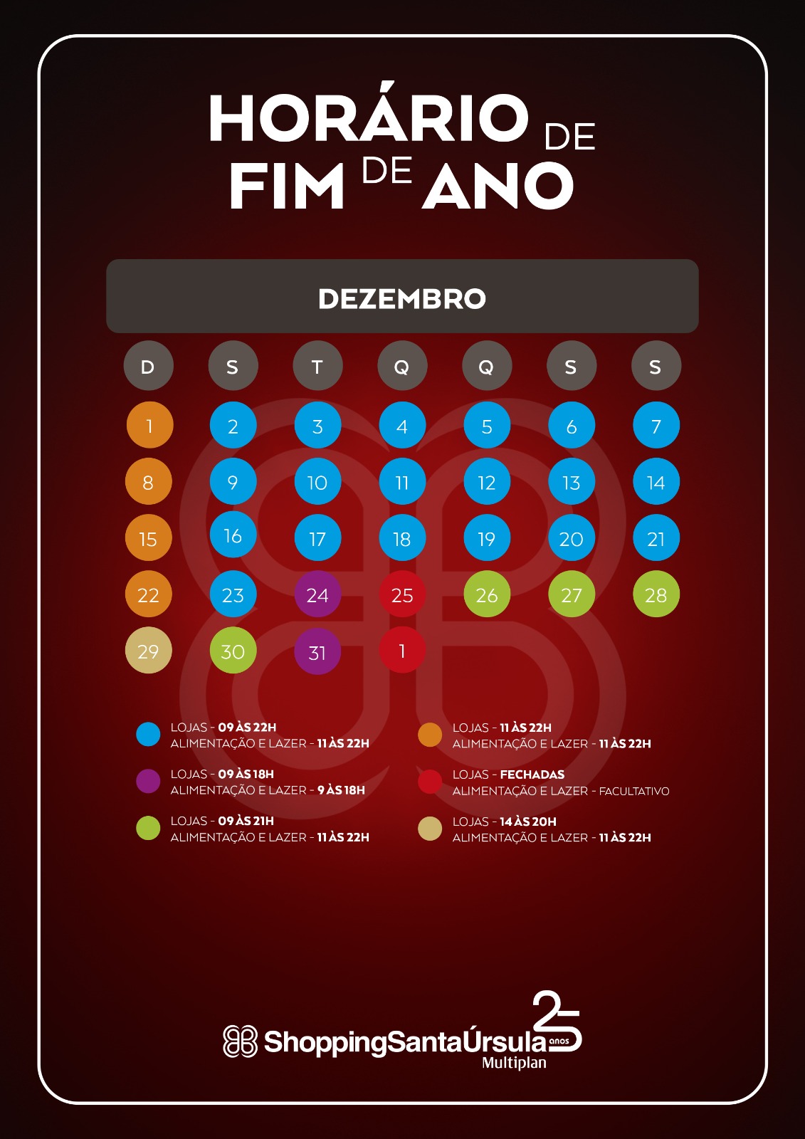 O ShoppingSantaÚrsula informa os horários especiais de funcionamento neste mês de dezembro: