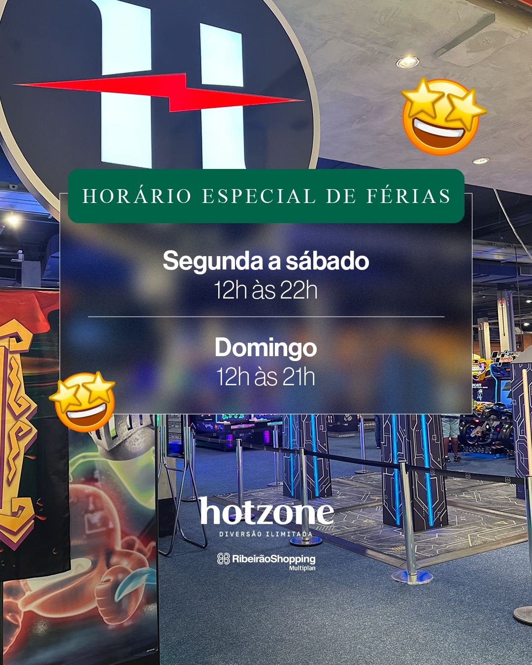 A HotZone do RibeirãoShopping traz mais diversão para as férias de janeiro. Durante todo o mês, o local, que fica no Setor Aquífero Guarani do empreendimento, terá horário especial de funcionamento, sendo das 12h às 22h, de segunda a sábado, e das 12h às 21h, aos domingos.
