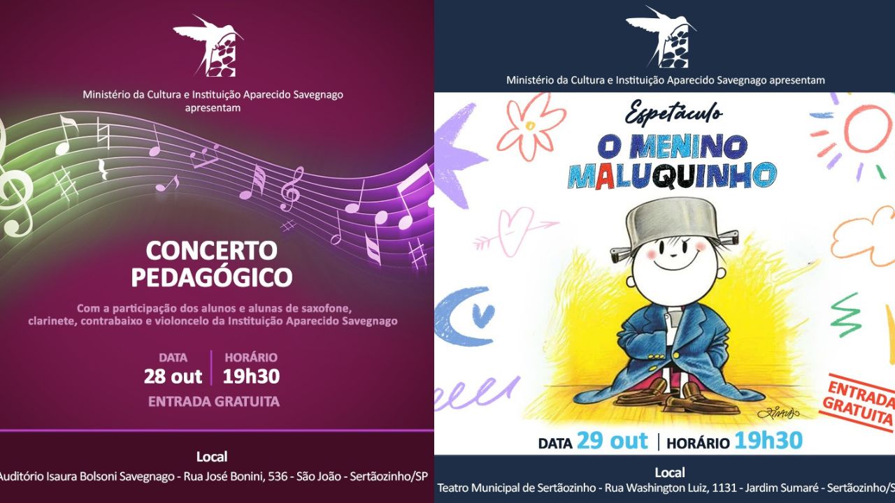Alunos de saxofone, clarinete, contrabaixo e violoncelo se apresentam no dia 28, na sede da entidade; Teatro Municipal de Sertãozinho recebe peça com alunos do curso de teatro, no dia 29. As duas exibições são gratuitas e abertas ao público