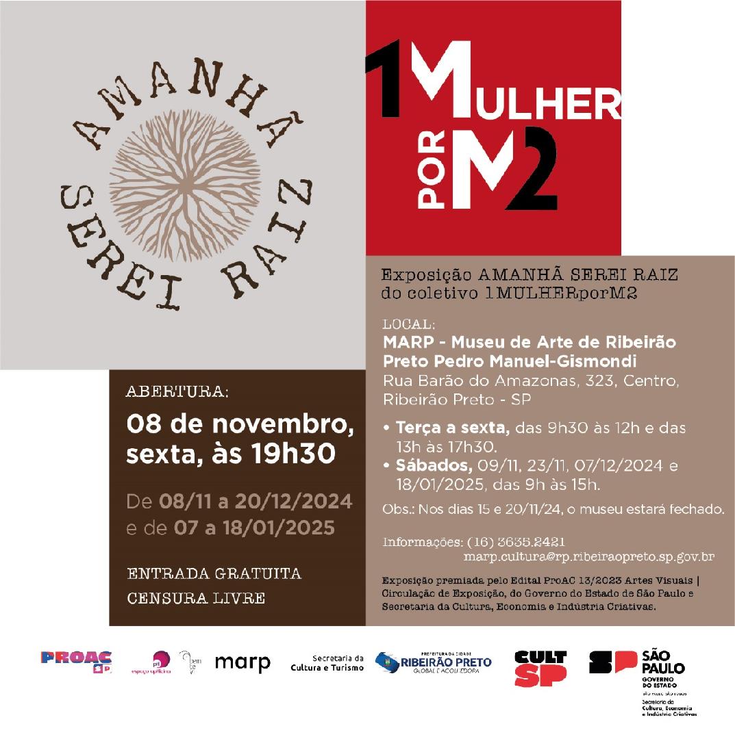 Com as artistas do coletivo 1MULHERporM2, participantes da mostra Amanhã Serei Raiz, em exposição no MARP. Mediação Nilton Campos. Neste encontro, os participantes terão a oportunidade de conversar com as artistas e poderão ter acesso a mais informações sobre as suas trajetórias artísticas, as suas pesquisas, seus processos de trabalho e sobre as suas obras.