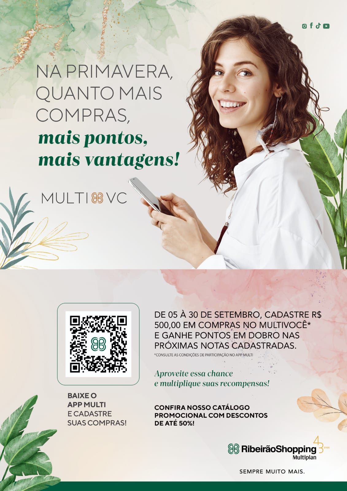 Que tal começar a cadastrar suas notas fiscais no MultiVocê, Programa de Relacionamento da Multiplan e RibeirãoShopping, e começar a aproveitar os benefícios do programa? Para incentivar a participação dos clientes, o empreendimento lança uma Campanha de Primavera, que dá pontos em dobro nas próximas notas fiscais lançadas, para quem cadastrar R$ 500,00 em notas fiscais de compras realizadas no shopping, durante o período de 05 a 30 de setembro.