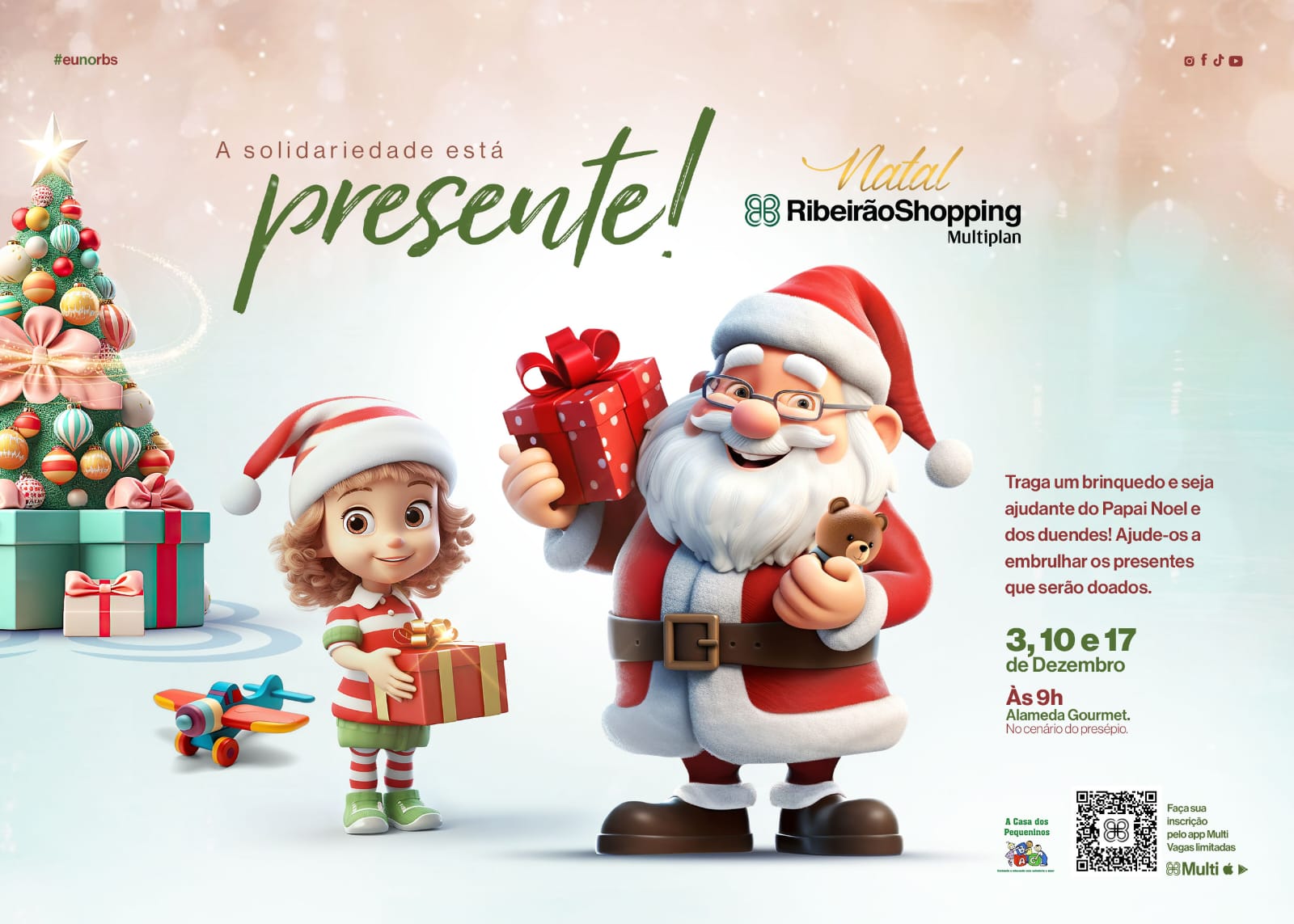 Uma oportunidade para as crianças serem ajudantes do Papai Noel neste Natal. O RibeirãoShopping promove e convida as famílias para uma oficina solidária nos dias 3, 10 e 17 de dezembro, domingo, às 9 horas, na Alameda Gourmet, com a presença dos duendes e do Papai Noel. A atividade é gratuita e a inscrição deve ser feita pelo app Multi. Vagas limitadas.