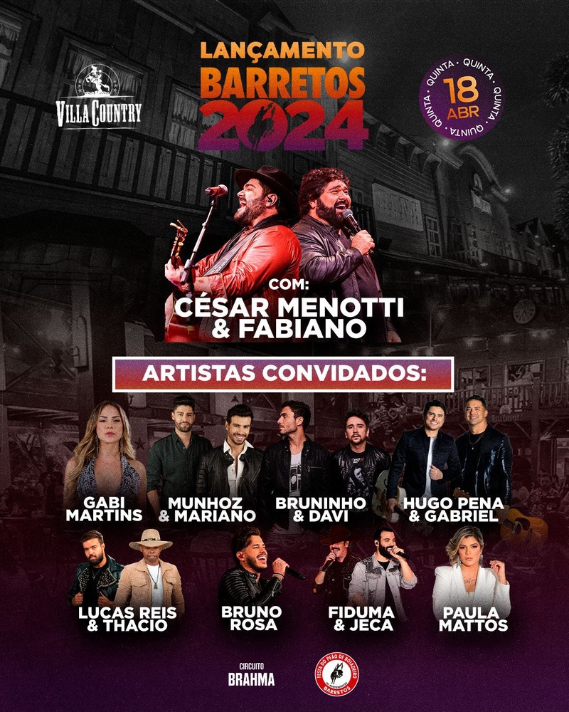 O aguardado lançamento da Festa do Peão de Barretos na capital paulista, com show da dupla embaixadora desta edição, César Menotti & Fabiano, já tem confirmadas diversas participações especiais. O evento acontece no dia 18 de abril, quinta-feira, na tradicional casa noturna sertaneja Villa Country.